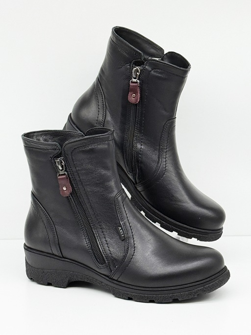Axel 4519 – eleganckie botki z naturalnej skóry. Ocieplone mikrofibrą, z polarową wkładką. Dwa boczne zamki ułatwiają zakładanie. Subtelna ozdoba – bordowe przypinki. Antypoślizgowa podeszwa, koturn 4 cm. Idealne na chłodne dni.