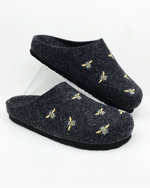 W eleganckiej szarości, cholewka ozdobiona wyhaftowanymi żółtymi pszczółkami. Wyjątkowo urocze.