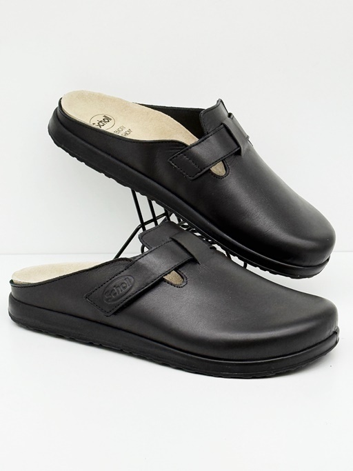 Kapcie ortopedyczne Scholl ELIO Strap F32531 czarne skórzane, poszerzana tęgość H