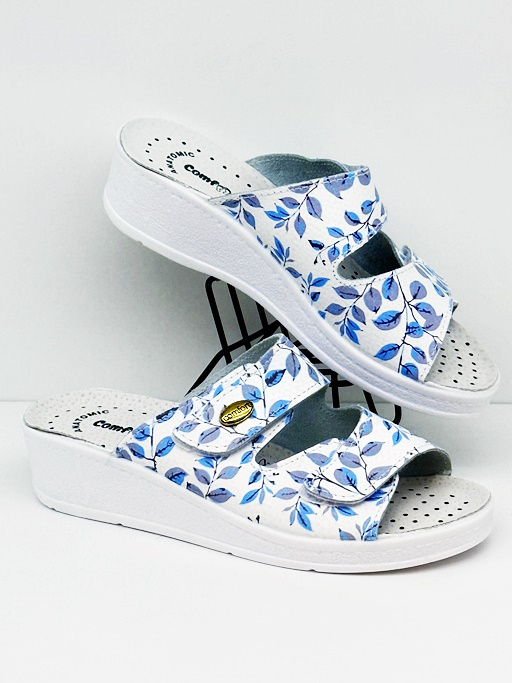 Klapki damskie Comfooty Giulia Fant.57 białe/niebieskie listki - regulowana tęgość G-H