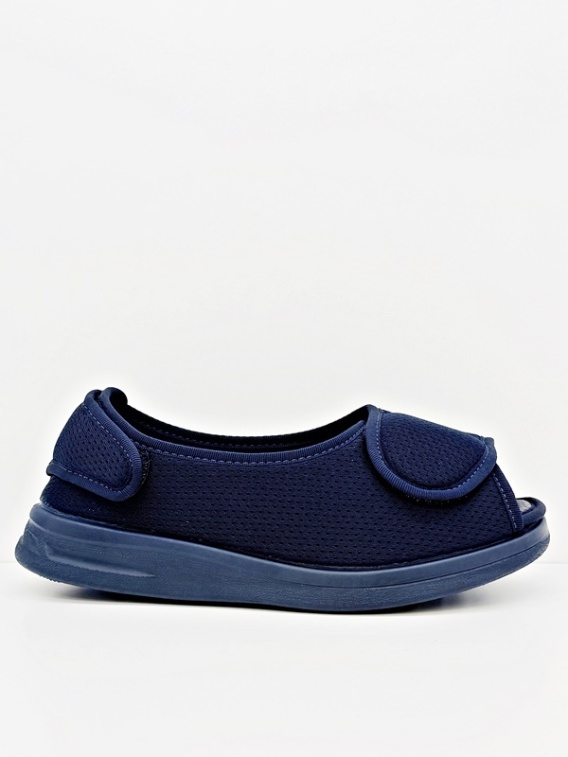 Damskie sandały ortopedyczne Dr Orto (542D003) w kolorze granatowym to specjalistyczne obuwie o bardzo dużej tęgości M. Wykonane z miękkich tkanin, posiadają pełną regulację na rzepy oraz wyjmowaną wkładkę z jonami srebra o właściwościach antybakteryjnych. Model przeznaczony dla stóp z obrzękami, zmianami cukrzycowymi i reumatoidalnymi. Zapewnia najwyższy komfort, możliwość prania wkładki oraz stabilizację chodu dzięki antypoślizgowej podeszwie o wysokości 3 cm
