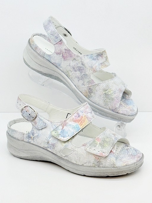Sandały Waldläufer Merle 811016 multi srebrne – tęgość M-N dla bardzo szerokich stóp i wysokiego podbicia. Skóra cielęca, potrójna regulacja, wyjmowana wkładka ortopedyczna i stabilna podeszwa 4 cm.