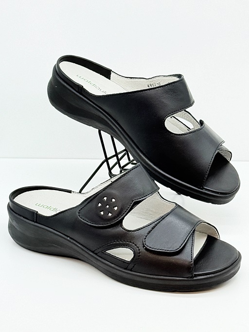 Klapki w całości z naturalnej skóry. Oba paski z regulacją rzepową. Wkładka wyprofilowana, pod palcami otworki wentylujące.