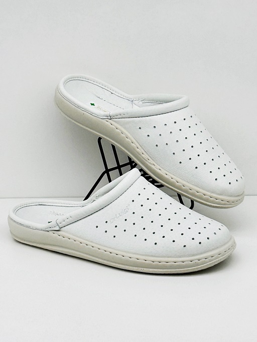 Białe pantolety Dr Luigi PU-01-01-11-01-KS ze skórzaną perforowaną cholewką i profilowaną wkładką wspierającą łuki stopy. Redukują zmęczenie, poprawiają krążenie i łagodzą przeciążenia. Tęgość H czyni je idealnym wyborem na szersze stopy. Komfortowe w pracy i na co dzień.